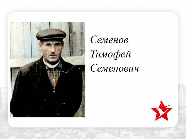 Семенов Тимофей Семенович, мой дедушка-герой. Служил в 76 гв. осапб 67 гв.сд. Участвовал в Юго-Западном, Донском, Воронежском, втором Прибалтийском фронтах. Для пропуска наших частей и техники через реку, сапер Семенов Тимофей выполняя работу по строительству переправы, работая по 16 часов в сутки в воде и под огнем противника, самоотверженно, вовлекая других, справился в срок. За мужество и отвагу он представлен к Медали за отвагу. Гвардии ефрейтор Семенов Тимофей за время службы показал себя мужественным, отличным минером. В районе местечка Жагаре, на участке 196 гв. сп. под артиллерийским огнем противника проделал проход для общевойсковой разведки в проволоч. заграждении. Там же установил 200 противотанковых и150 противопехотных мин. Вместе с двумя саперами он, не смотря на сильный ружейно-пулеметный огонь противника, сделал на участке 199 гв. сп. проход и пропустил через него две роты пехоты. При проверке дороги снял 8 против. мин, при выполнении боевого задания был ранен, но в госпиталь идти отказался. Удостоен Ордена Славы. Имеет Медаль "За отвагу", Медаль "За оборону Сталинграда", Орден Красной Звезды, Орден Славы 3 степени.