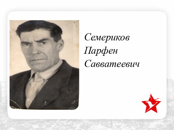 Мой дед, Семериков Парфен Савватеевич, родился в д. Упорово Буткинского района Свердловской области 19.02.1906г.. На второй день войны был призван с родным братом на фронт, воевал на Ленинградском фронте был серьезно ранен, После полугодового лечения в госпиталях в г. Луганске (Украина) , г.Тбилиси (Грузия) в январе 1943 года вернулся домой инвалидом, но продолжил свой подвиг, работая в колхозе.