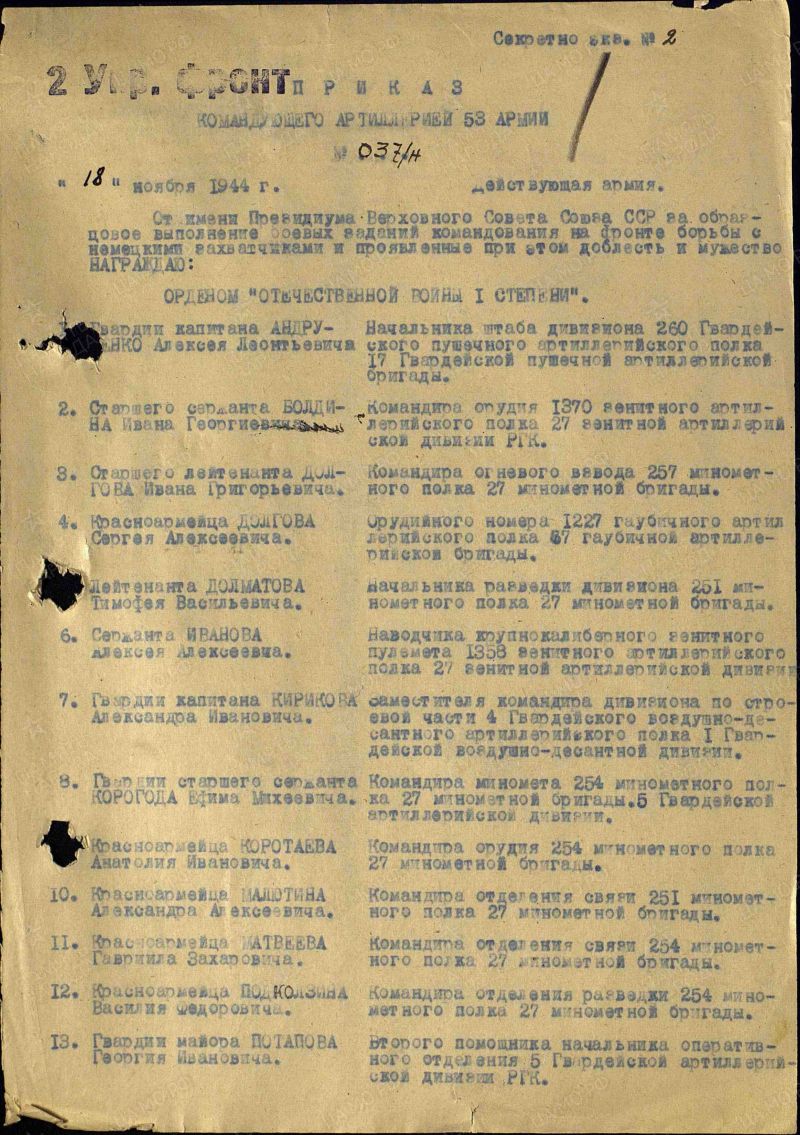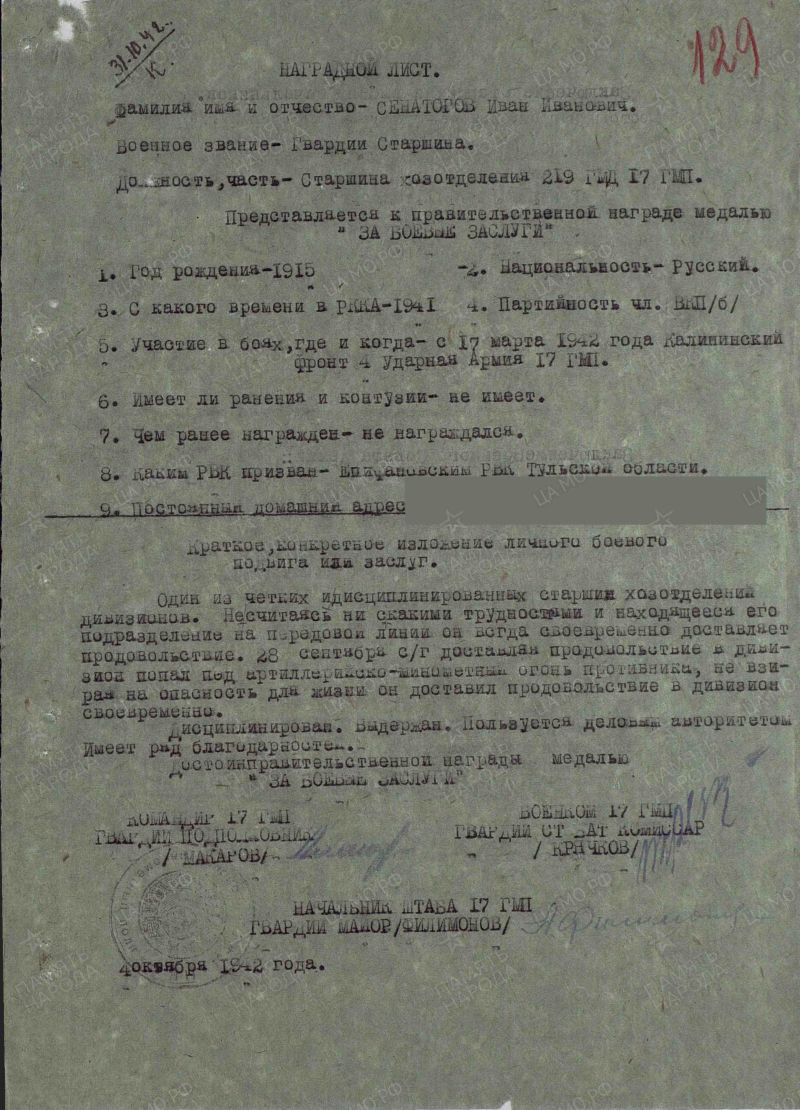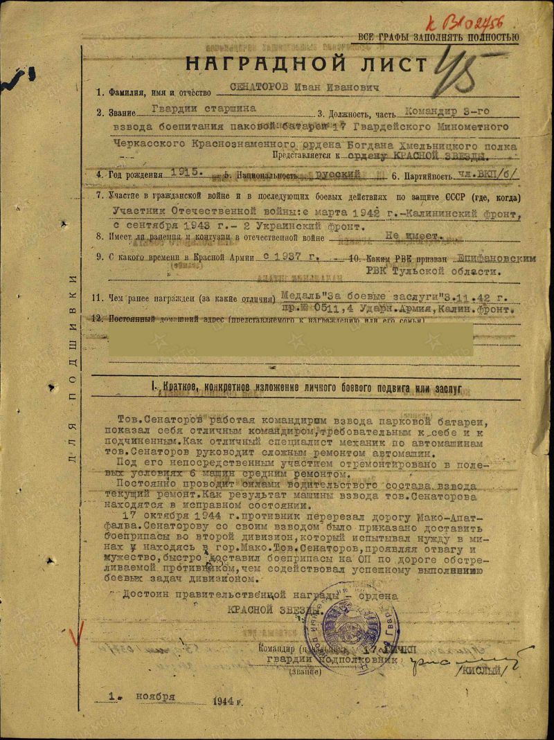 Иван Иванович Сенаторов родился в 1915 году в селе Колодези Тульской области, в 1937 году был призван в ряды Красной армии Епифанским районным военным комиссариатом, до призыва в армию имел специальность механик. Сенаторов И.И. прошел всю Великую Отечественную Войну воевав на разных фронтах Красной армии - калининский фронт, Степной фронт, 2 - ой Украинский фронт. За годы войны Сенаторов И.И. неоднократно представлялся к государственным наградам и ему объявлялись благодарности. По окончании ВОВ Сенаторов И.И. вернулся на свою малую Родину. Он женился и у него родились трое детей - две девочки и один мальник. Иван Иванович построил дом в деревне Щербаковка (Малая Полунинка) Узловского района Тульской области где и проживал вместе со своей семьей. Работал он механиком машинно - тракторной станции. В 1960 году он заболел и вскоре скончался.