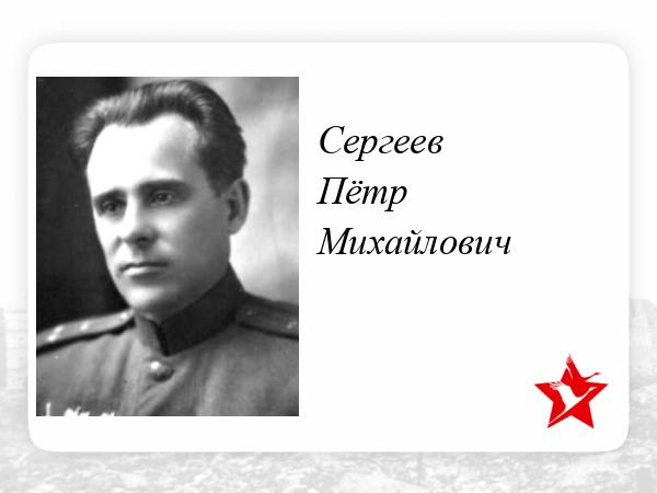 Сергеев Пётр Михайлович родился 6.12.1903 г. во Владимирской области. Его старшие братья Павел Михайлович и Иван Михайлович погибли рано. Первый в I империалистическую войну, второй – в Гражданскую. После окончания рабфака Богородский уездный комитет ВКП(б) командировал Петра Михайловича учиться в Военно-медицинскую Академию.