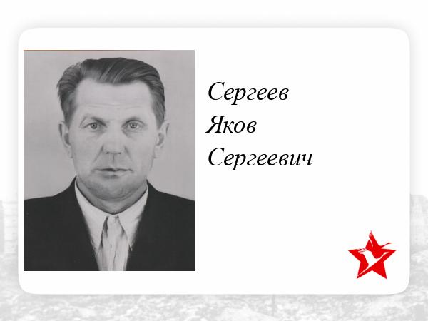 Сергеев Яков Сергеевич родился в 1911 году. У него было 8 детей. 1934,1936,1937,1938,1941,1949,1950,1951 гг рождения. Прошел всю войну,не получив не одного ранения.Был награжден красной звездой,были и другие награды,но точной информацией не владеем.Он очень не любил говорить о войне.