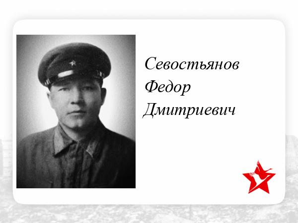 Севостьянов Фёдор Дмитриевич родился 15 июля 1915 года в деревне Нижняя Кумашка Шумерлинского района. До войны работал председателем райпотребсоюза. На фронт был призван в феврале 1942 года в возрасте 26 лет. Прошёл трёхмесячный курс «Молодого бойца» в г.Канаш. К тому времени у него было двое сыновей, один из которых мой папа – Алексей.