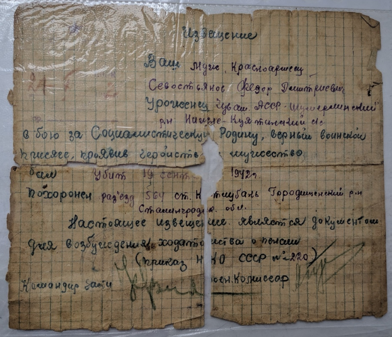 В сентябре 1942 года из Сталинграда пришла похоронка: «Ваш муж, красноармеец Севостьянов Фёдор Дмитриевич, в бою за социалистическую Родину, верный воинской присяге, проявив героизм и мужество, был убит 19 сентября 1942 года. Похоронен разъезд 564…». Но, к счастью, произошла ошибка, дедушка не погиб, а во время одного из боёв от взрыва был тяжело ранен и контужен. Его часть по приказу ушла с этих позиций вперёд в наступление. На лежащего без сознания и заваленного землёй дедушку случайно наткнулись артиллеристы другой части, они доставили его в медсанбат. Позже в составе эвоко-госпиталя был отправлен на лечение в Ташкент, где проходил лечение с конца сентября 1942 года по июнь 1943 года. Фёдора Дмитриевича оперировал известный хирург из Одессы, доктор медицинских наук, профессор В.П.Филатов. Через 2 месяца из госпиталя пришло письмо о том, что дедушка жив. А похоронку мы по сей день храним как память о тех страшных событиях. Просто в боевых условиях точные сведения дать не могли и приняли решение, что дедушка погиб. Благодаря мужеству, героизму и самоотверженности бойцов немцы были разгромлены.