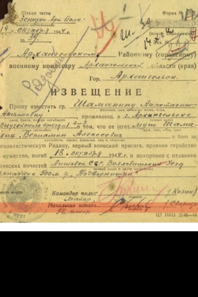 Мой Дедушка, Шаманин Вениамин Алексеевич, родился в 1906 году в г. Вельск Архангельской области. Несмотря на то, что у него была бронь, (дедушка был управляющим Онежского филиала Центробанка),и только-только родилась дочь (в октябре 1942 года родилась моя мама),он ушел добровольцем на фронт в 1942 году. 18 октября 1944 года Шаманин Вениамин Алексеевич пал смертью храбрых при артобстреле, по данным из донесения о безвозвратных потерях - последнее место службы Деда - 34 Зенитная дивизия РГК, военное звание - рядовой, должность/специальность - радиотелеграфист.