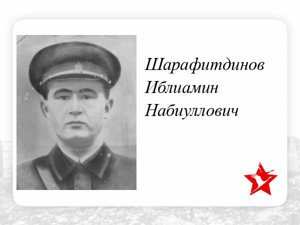 Шарафитдинов Иблиамин Набиуллович, родился в 1911 году в деревне Ташлы или Кугарсын (в переводе "Голубь", так как его мать была родом из этой деревни) Белебеевского района Республики Башкортостан. В 1939 году участвовал на войне с финнами. В 1941 году ушел на фронт и не вернулся, пропал без вести. Работал он на железной дороге в городе Челябинск.