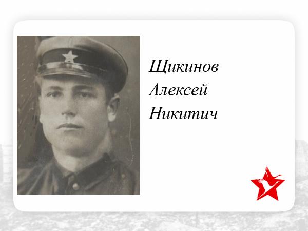 Наш дедушка был призван на войну из ст. Апшеронской, сейчас г. Апшеронск Краснодарского края. Военный эшелон в котором ехал наш дедушка попал под бомбежку под городом Житомиром. Его тело разорвало на части. С нашим дедом были его земляки, они собрали его по частям и захоронили в братской могиле в лесополосе. Нам конечно очень жаль, что так получилось, ему было 29 лет. Наша бабушка Щикинова, в девичестве Михайлец, Анна Александровна, осталась с двумя маленькими детьми, сын Анатолий в возрасте 6 лет и дочь Антонина 4 года. Бабушка рассказывала, что дедушка был очень хорошим семьянином, любил детей, заботился о них. Конечно бабушке было очень тяжело, ей приходилось много работать. В Станицу зашли немцы и заняли дома местных жителей. Бабушке тоже пришлось освободить дом для непрошенных гостей. Хорошо, что было куда уйти. В домик своей матери, нашей прабабушке. Детей прятали на печке, немцам пришлось отдавать свои продуктовые запасы. Бабушка рассказывала, что они помогали нашим пленным солдатам, через забор ухитрялись просунуть им продукты и лекарства. Немцы ушли из станицы к боевым действиям на Туапсэ, там были разбиты нашими войсками. Война принесла горе в каждую семью, страшно подумать, что пришлось испытать нашему народу. Мы всегда будем помнить нашего дедушку и память о нём передавать нашим внукам. Вечная память.