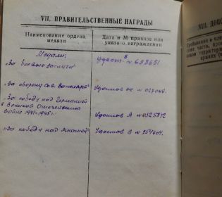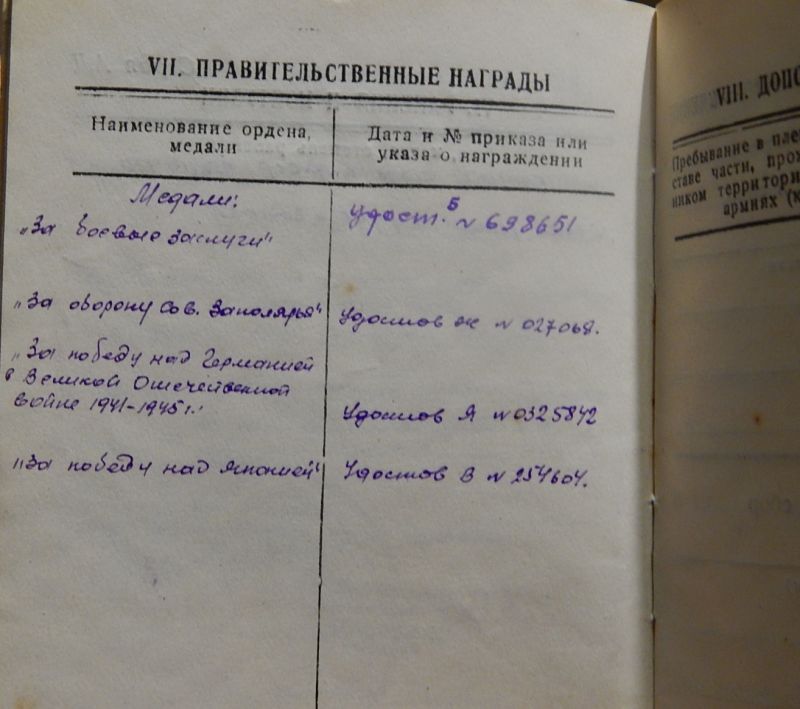 Награжден медалями: «За боевые заслуги», «За оборону Советского Заполярья», «За оборону Ленинграда», «За Победу над Германией в Великой Отечественной войне 1941 – 1945 г.г.», «За Победу над Японией», и другими послевоенными наградами.