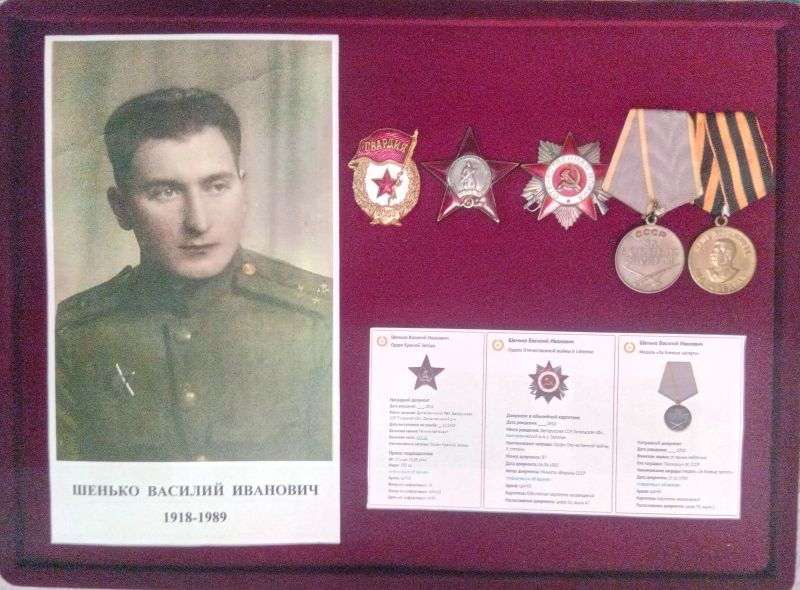 Мой дед по маме Василий Иванович Шенько родом из Белоруссии, окончил в 1938 году Витебский кинотехникум, а в октябре 1939 года был призван Домановичским РВК БССР в ряды Красной армии. Участвовал в советско-финской войне 1939-1940 годов. Прошел всю Великую Отечественную войну в званиях техник-лейтенант и старший техник-лейтенант. В сентябре 1944 года был награжден орденом Красной Звезды за самоотверженную и честную работу со следующим описанием подвига в наградном листе: "Техник-лейтенант Шенько Василий Иванович за короткий период работы в дивизии обеспечил отличное кинообслуживание наших частей и подразделений в период боев на Днестровском плацдарме. За один лишь июль м-ц, своей кинопередвижкой т. Шенько дал 64 киносеанса для бойцов и командиров находившихся на переднем крае. Несмотря на артиллерийско-минометный обстрел пр-ка л-нт Шенько не сорвал ни одного сеанса и обеспечил полную сохранность киноаппаратуры". В послевоенное время продолжил службу в звании капитана.
