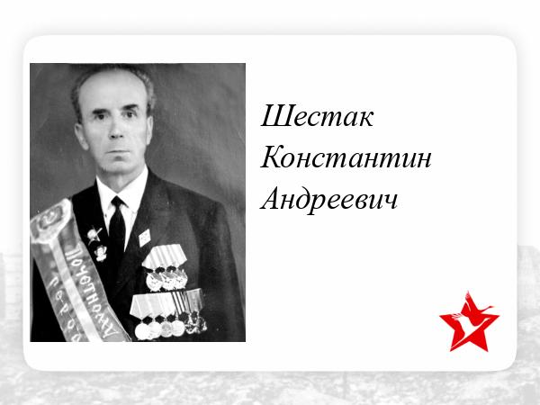 В апреле 1944 Константин Андреевич был назначен командиром 374-го полка 128-й стрелковой дивизии. Наши войска подошли к Пскову. В течение четырёх месяцев полк в трудных условиях лесисто-болотистой местности оборонялся на участке Горнево – Бердово. Бойцы вели разведку позиций противника, готовились к штурму оборонительной линии противника «Пантера». Рано утром 22 июля 1944 года полк Шестака с приданными частями атаковал ключевые позиции фашистов. За шесть часов боя подразделения полка освободили Кресты, вышли к вокзалу, затем к реке Великой и в районе Покровской башни с ходу форсировали реку, используя подручные средства – бревна, доски, двери. В районе Мирожского монастыря овладели плацдармом. Воинов полка поддерживали 40 орудий 122-го миномётного полка, 292-й артполк, дивизион гвардейских миномётов, батальон 741-го полка под командованием И. Баранова. В этих боях активно действовали истребительно-противотанковые батареи. Фашисты со своей стороны вели огонь со всех направлений и тоже из всех видов оружия. 23 июля полк Шестака освободил левую часть реки – Завеличье – и продолжил наступление в западном направлении... За героизм, проявленный воинами при освобождении Пскова, 374-й стрелковый полк был награждён орденом Красного Знамени. В наградном листе командира полка читаем: «За овладение Псковом и форсирование реки Великой командир полка К.А. Шестак награждён орденом Боевого Красного Знамени». В приказе Верховного Главнокомандующего от 23 июля 1944 года Константину Андреевичу была объявлена благодарность. В боевой характеристике сообщалось: «...В бою за город Псков подполковник Шестак показал себя смелым командиром, тактически грамотным, умеющим быстро принимать решения». В должности командира полка он принимал участие в освобождении города Тарту, посёлков Пухья (Эстония), Силезии, городов Бриг, Глейвиц, Гиндербург, Нейсе и других. Тяжёлое ранение получил на 1-м Украинском фронте 19 февраля 1945 года у селения Штрелен. День Победы встретил в Москве, в госпитале.
