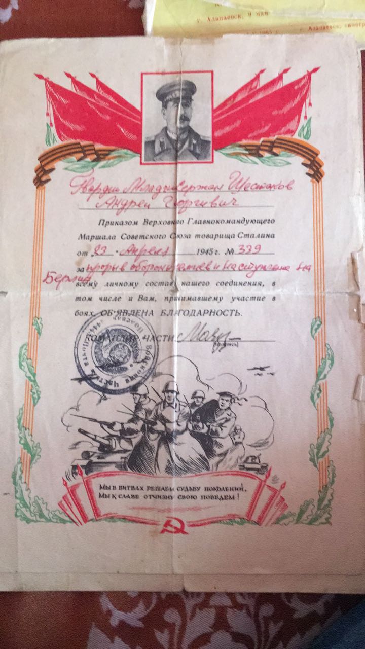 Шестаков Андрей Георгиевич родился 17 октября 1905 годи и уже с 9 лет пришлось зарабатывать на хлеб в батраках у кулаках. На фронт ушёл в35 лет. В годы Великой Отечественной войны механик-водитель танка громил врага под Ленинградом и в составе войск первого белорусского фронта штурмовал Берлин, где был удостоен личной благодарности Маршала Жукова. Его боевые дела отмечены двумя орденами и многими медалями. Боевые товарищи звали его Батя. После демобилизации в августе 1945 года работал на предприятии родного города Алапаевск.
