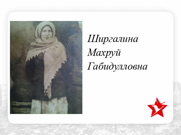 Прабабушка всю жизнь ждала мужа, не верила похоронке. Ее и прадедушку Ширгалиева (Ширгалина) Имаметдина связывала большая любовь, они жили душа в душу. У прадедушки была бронь по возрасту и здоровью, несмотря на это, он строил военный завод в Алкино почти год. Через несколько месяцев после возвращения, кто-то написал донос на местного начальника, а тот рассудил так, что так грамотно мог написать только прадедушка, потомственный учитель и просветитель.