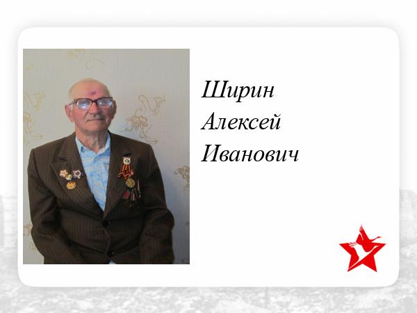 Ширин Алексей Иванович родился 17 февраля 1926 года в селе Промысловка Лиманского района Астраханской области. Окончил Промысловскую школу, получил 8-летнее образование. Ему было 15 лет, когда началась Великая Отечественная война. В октябре 1943 года в возрасте 17 лет был призван в ряды Советской армии. С октября по март 1945 года служил в воинской части 33549 в 8.стр. полку – пулеметчиком- кавалеристом. В марте 1945 года под Берлином был ранен в левую лобную часть головы, потерял глаз. Когда солдаты собирали раненых, его даже не хотели брать, так он был очень тяжело ранен, без сознания. Но его узнал земляк и уговорил солдат забрать раненного в госпиталь. Три дня солдат был в бессознательном состоянии и только благодаря усилиям военных врачей, пришел в себя .С марта по август 1945 года Алексей Иванович находился в военном госпитале № 2454, где и встретил радостную весть о Победе!