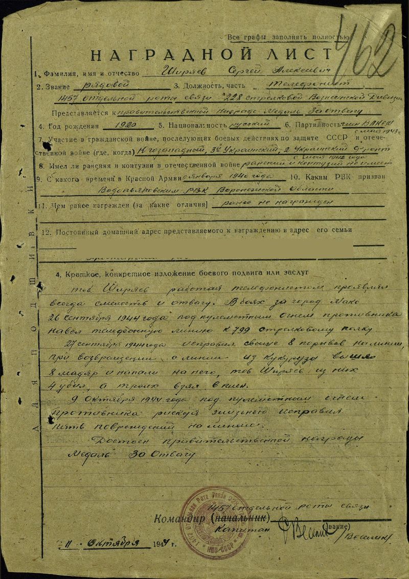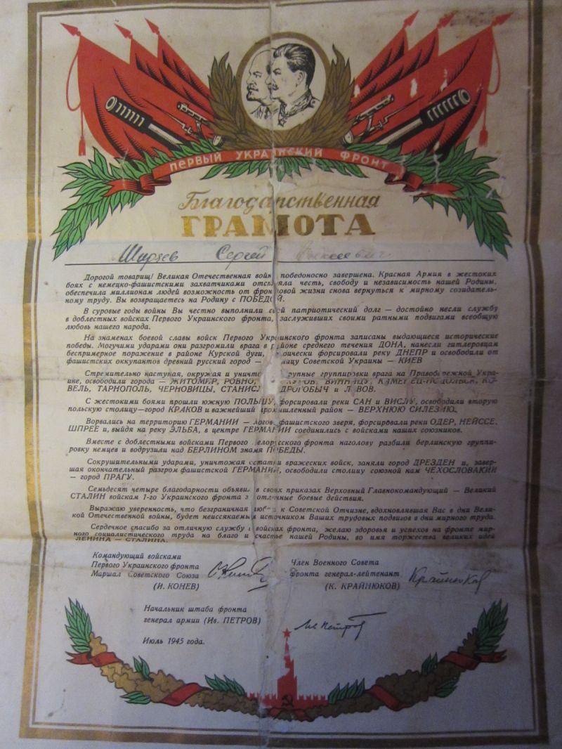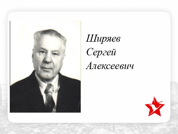 Ширяев Сергей Алексеевич родился 1 декабря 1920 г. в с .Калинино Водопьяновского р-на Воронежской области. Родители Ширяевы Алексей Гаврилович и Мария Алексеевна. Рос и учился в с.Калинино, был конюхом на конюшне. 04.12.1940 г. призван Водопьяновским РВК Воронежской области к службе в РККА. Служил в 4 танковом полку, 1457 отд.роте связи, 605 отдельном батальоне связи, 25 батальоне аэродромного обслуживания полевых кабельных линий - телефонистом. Участник освобождения СССР, Венгрии, Румынии. Неоднократно под пулеметным и минометным огнем противника восстанавливал разрывы телефонного кабеля, на повозке, запряженной лошадью Машкой, и груженой бабинами с кабелем прокладывал кабель между командными пунктами дивизий, обеспечивая командира дивизии связью. 27.09.1944 г. при возвращении с линии на него напали 8 человек мадьяр, он в одиночку убил 4 человек и троих взял в плен. За проявленное мужество и бесперебойное обеспечение связью награжден Орденом «Красная Звезда», Орденом Отечественной Войны II степени, Медалью «За Отвагу», Медаль «За Победу над Германией» и другими наградами. Был контужен и легко ранен. Уволен в запас 5 мая 1946 г.