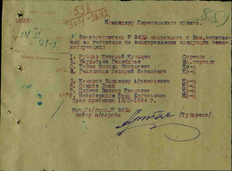14.02.1944 г выбыл из госпиталя ЭГ 2453, по выздоровлению, в СПП Закавказского ВО, затем, 16.02.1944г, был направлен в запасной стрелковый полк- 136 зсп с командой № 503.Место дислокации г Зугдиди, Грузинской ССР, 45 армия.