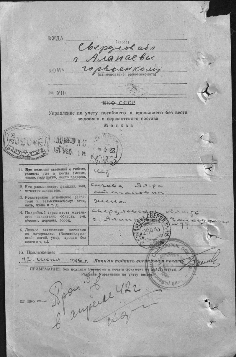 Александр Игнатьевич после лишения семьи избирательных прав в 1932 году уехал в г. Алапаевск Свердловской области. Возможно к родственникам. На фото он в милицейской форме. Там женился. Жена Сычёва Александра Степановна, разыскать её не удалось. Призывался Александр Игнатьевич из Алапаевска, пропал без вести в апреле 1942 г. Последнее письмо было 18 января 1942 г. из г. Данилова Ярославской области, п/я 14/3 В