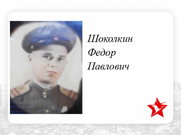 Мой дед, мамин папа, Шоколкин Федор Павлович (1917-1996гг), родом из Саратовкой области, Ртищевского района, деревни Осиновка. В начале войны воевал в Керчи, а также, на Северном Кавказе. Два раза был в плену - в Сальске и под Таганрогом, откуда бежал и до конца войны партизанил в Югославии. По окончании войны еще год служил в Австрии и в Чехословакии (до 1946 года). Награжден Орденом Отечественной войны II степени, а также юбилейными медалями.