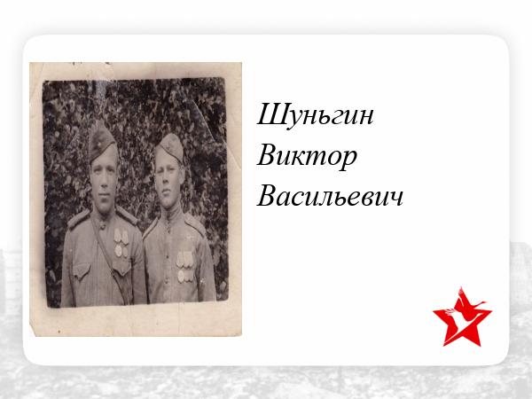 Родился в 1924 году. Уроженец Архангельской области, Приморского района. На Великую Отечественную войну призывался Маймаксанским РВК г.Архангельска. Награжден медалью "За боевые заслуги". из наградного листа: "Шуньгин В.В. являясь связным при штабе артиллерии в период занятия боевого порядка за четыре часа розыскал штабы при данных арт. частях и атр. подразделениях 80 стрелковой дивизии и установил с ними связь. В процессе боя в условиях плохой изученности маршрутов в ночное время под арт. обстрелом противника, доставил подразделениям в срок 15 пакетов с боевыми документами." Также медалью "За отвагу". Из наградного листа:" ефрейтор Шуньгин во время боев находился на НП и под сильным атр.-минометным обстрелом, выполнял ответственные поручения по доставке пакетов в арт. части и подразделения и вел наблюдение за противником. В результате которого обнаружил 5 огневых точек, которые были уничтожены огнем орудий прямой наводки".