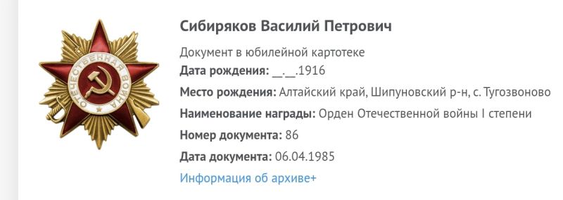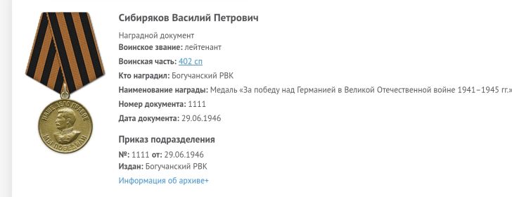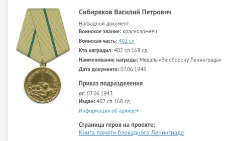 Сибиряков Василий Петрович, 1916 г. р. Место рождения Алтайский край, Шипуновский район, с. Тугозвоново. До войны жил в Красноярском крае, Богучанский район, с. Богучаны. Призван Богучанским РВК в 1942 году. Красноармеец. Стрелок. В/ч 402 сп 168 сд. Участник обороны Ленинграда. Тяжело ранен в январе 1944 года. ЭГ 1015,1170. Награждён медалью За оборону Ленинграда, медалью За Победу над Германией в Великой Отечественной войне 1941-1945 гг., юбилейным орденом Отечественной войны 1 степени.
