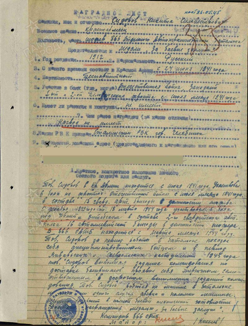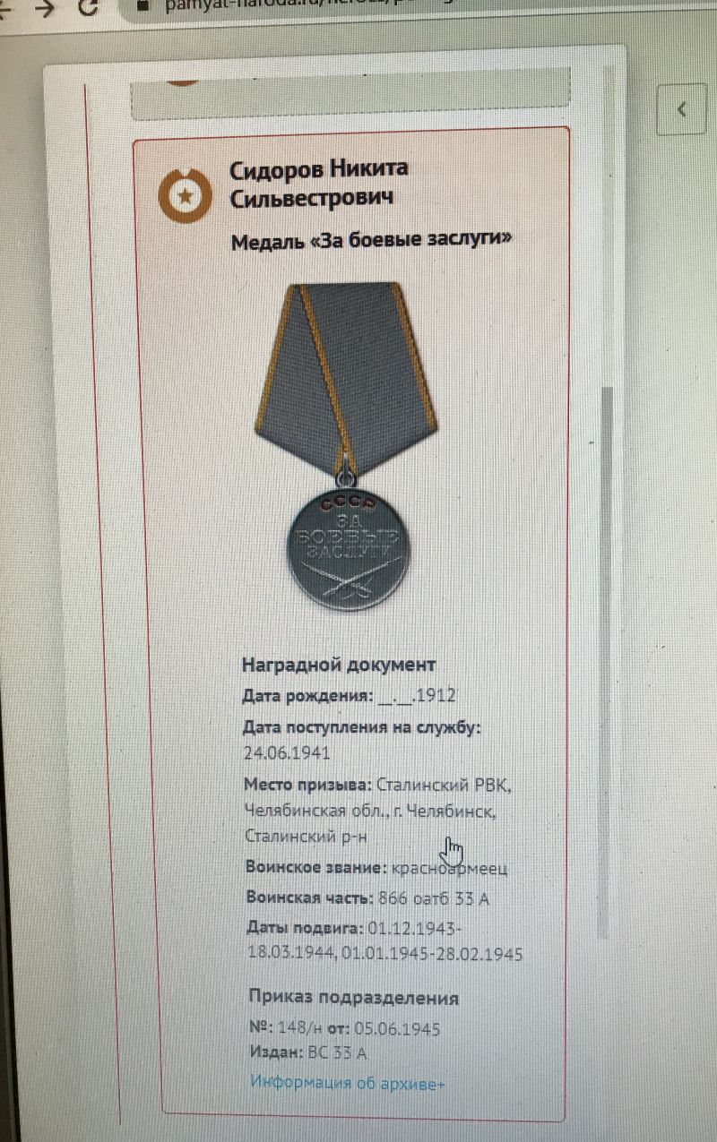 Мой дед - Сидоров Никита Сильвестрович ушёл на фронт в самые первые дни войны (24.06.1941 г.) и воевал в составе 866 отдельного автотранспортного батальона 33 Армии (оатб 33 А). Пройдя самоотверженно свой боевой путь за рулём легендарной "трёхтонки" ЗИС-5, получил боевые награды за отвагу и мужество, в том числе: медаль "За боевые заслуги" за участие в боях под Оршей и Витебском, медаль "За победу над Германией в Великой Отечественной войне 1941-1945 г.г.". Он дошёл до Берлина, с победой вернулся домой и добросовестно трудился на ферросплавом заводе г.Челябинска до выхода на пенсию.