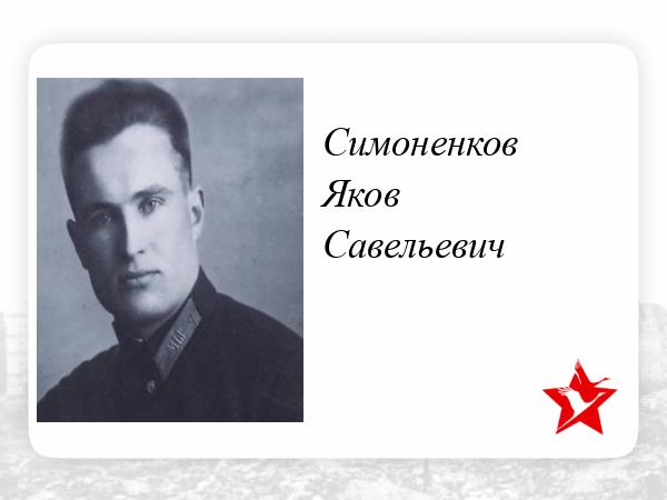 Мой дедушка – Старший сержант, Симоненков Яков Савельевич, родился 15 августа 1915 года, в деревне Малые Земнички, Смоленской области, Кировского района. В 1933 году, в возрасте 18 лет поступил в Свердловскую школу милиции. Закончил ее и работал в Москве оперуполномоченным уголовного розыска. С 1942 по 1944 год участвовал в Великой Отечественной войне. 30 июля 1943 года был тяжело ранен в ногу и получил осколочное ранение черепа в области теменной кости. После войны прадедушка работал оперуполномоченным в городе Лебедянь Липецкой области, а потом они с прабабушкой переехали в город Советск Калининградской области. Некоторые вещи и медали прадедушки хранятся в историческом музее города Советск Калининградской области (бывший Тильзит). У моего прадедушки было четыре брата: Устин, Михаил, Тарас и Ярмак. Все ушли на фронт, защищать Родину. Симоненков Ярмак Савельевич вернулся с войны без ноги, а остальные братья без вести пропали на войне.