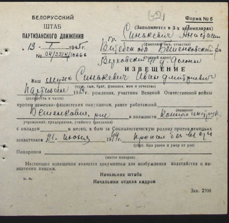 Что ее муж Синкевич Иван Дмитриевич партизан 1913 года рождения,участник Великой Отечественной войны против немецко-фашистких оккупантов,ранее работавший в Бешенковическом районе в должности конного инструктора,в бою за освобождение Родины против немецких захватчиков 21 июня 1944 г. Пропал без вести .