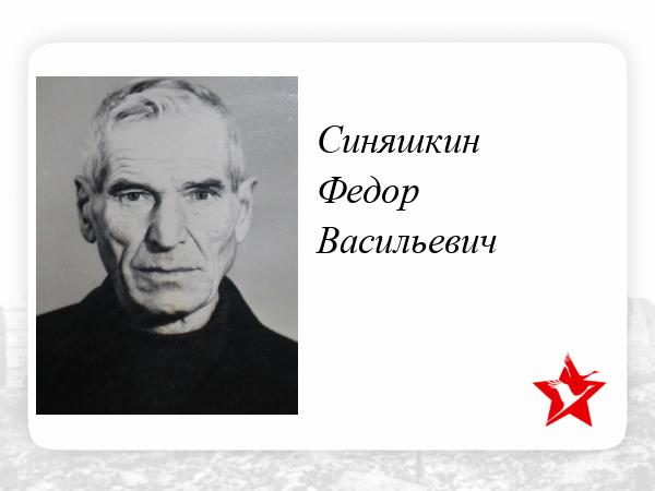 Деда Федя родился в 1912 году, в ряды Красной Армии был призван в июне 1941 года, к сожалению, о его военной службе мне мало что известно, по рассказам моего деда, сына Фёдора Васильевича, знаю, что он участвовал и во Второй Мировой Войне, дошёл до Японии. Был демобилизован в мае 1946г. Умер 2 июля 1987 года.