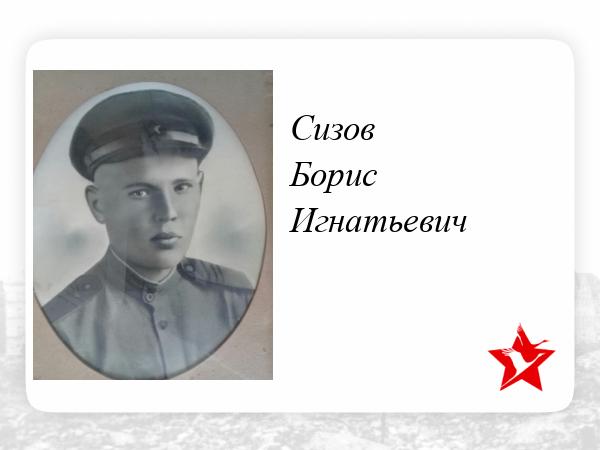 Борис Игнатьевич Сизов, мой дядя, был старшим в многодетной семье моей бабушки Натальи Михайловны и дедушки, который уже был на войне - Игнатий Васильевич. Это был крепкий и сильный, добрый и отзывчивый юноша. Когда ему исполнилось 18 лет сразу попал на линию фронта. Прощаясь с мамой Натальей Михайловной, долго смотрел ей в глаза - чувствуя, наверное, что не вернётся. Погиб под Кройцбургом, п. Славское, Калининградской области.