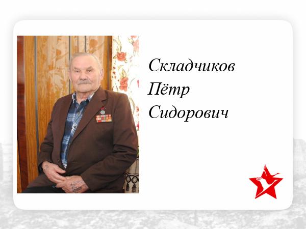 Складчиков Петр Сидорович - ветеран Великой Отечественной войны. Он родился 21 февраля 1925 года в селе Алябьево Пономаревского района Оренбургской области. До призыва на военную службу работал механизатором. В 1943 году, когда Петру Сидоровичу было 18 лет, он ушел служить на фронт. Воевал на третьем Украинском фронте. Был связистом. Четвертого апреля 1945 года получил медаль « За отвагу». Вот выписка из приказа: « Наградить Складчикова Петра Сидоровича за то, что в наступательных боях с 16 по 21 марта 1945 года в районе города Чекберень-Надвелег, работая линейным надсмотрщиком по направлению связи с соседом, в любым условиях и при любой обстановке шел на линию , быстро и аккуратно устранял неисправности и повреждения, чем обеспечил бесперебойную связь с соседом». 15 апреля 1945 года при взятии города Санит Пельтен батальон, которому Петр Сидорович давал связь, выходит за реку. Недолго думая, взяв телефонный аппарат и катушку кабеля, первым переплыл реку под сильным огнем, тем самым обеспечил командира полка связью для управления войсками. За этот подвиг он награжден орденом «Славы III степени». Участвовал в боях под Волгоградом, дошел до самого Берлина и встретил Победу. Также Складчиков Петр Сидорович имеет орден «Отечественной войны II степени», медаль « За Победу над Германией». Умер Складчиков П.С.11.01.2018 года.