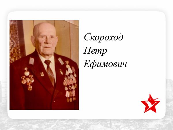 Скороход Петр Ефимович родился 29 января 1903 года в селе Стригуны Борисовского района Белгородской РСФСР . Родители Скороход Ефим Васильевич и Скороход Марфа Герасимовна . Через 2 недели после начала ВОВ 07.07.1941 был направлен в 348 полк . Учавствовал на защите города Славянска , был ранен на защите города Севастополя 27.05.1942. В 1942 году был контужен.