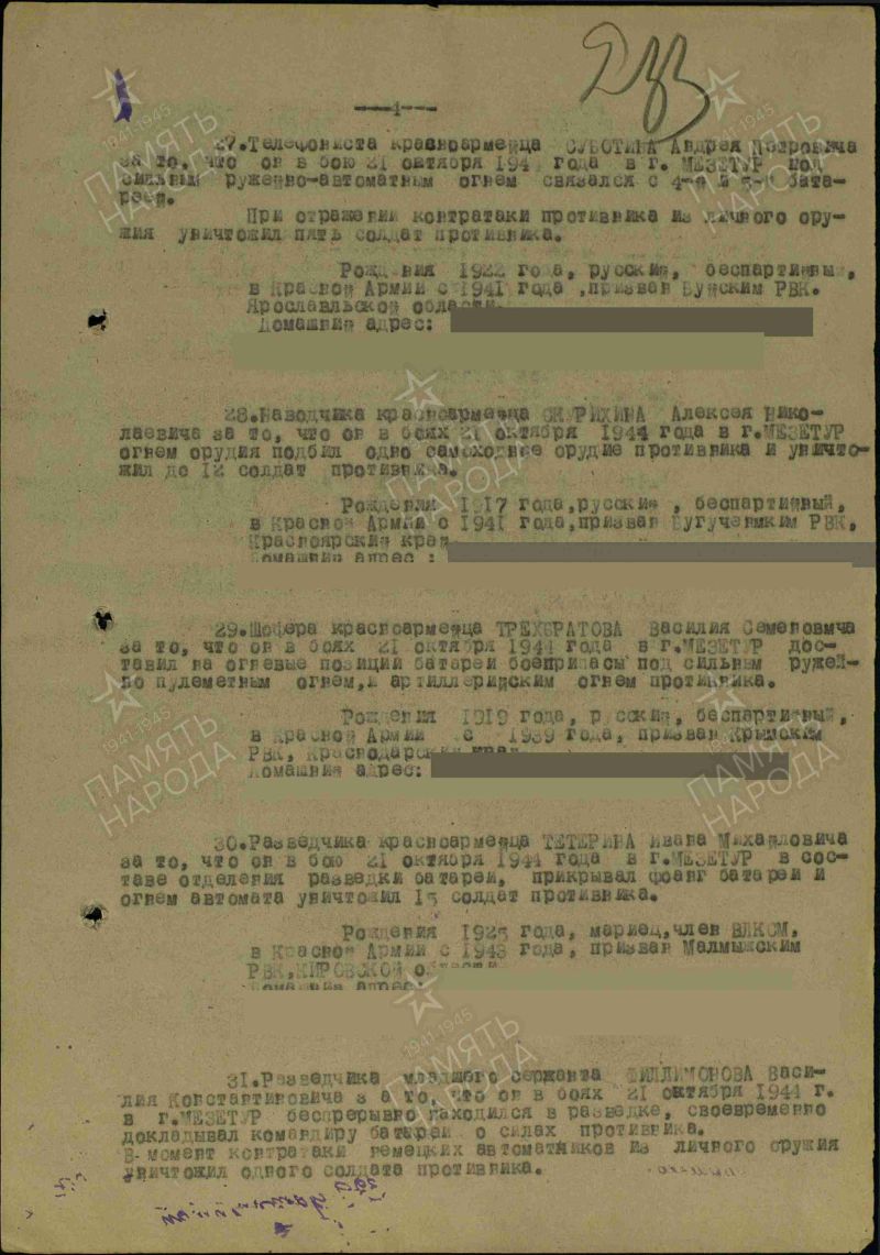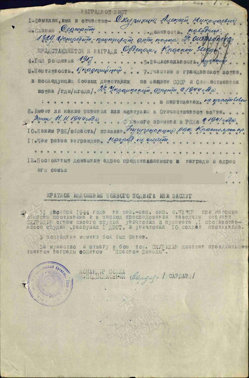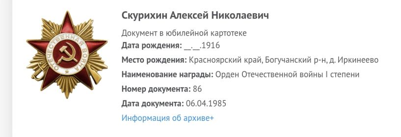 Скурихин Алексей Николаевич, 1917 г. р. Место рождения Красноярский край, Богучанский район, д. Иркинеево. Призван Богучанским РВК в 1941 году. Сержант. Наводчик орудия. В/ч 1329 иптап 2 оиптабр. Дважды ранен. Награждён медалью За отвагу, орденом Красной Звезды, юбилейным орденом Отечественной войны 1 степени.