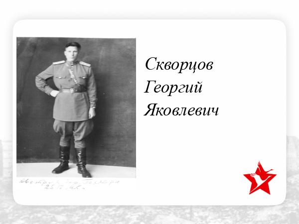 Мой дед, Скворцов Георгий Яковлевич, вернулся с войны живым, дошел до Австрии капитаном в должности начальника военно-технического снабжения 375 артиллерийского Челябинского полка 181 стрелковой Сталинградской ордена Ленина Краснознаменной дивизии