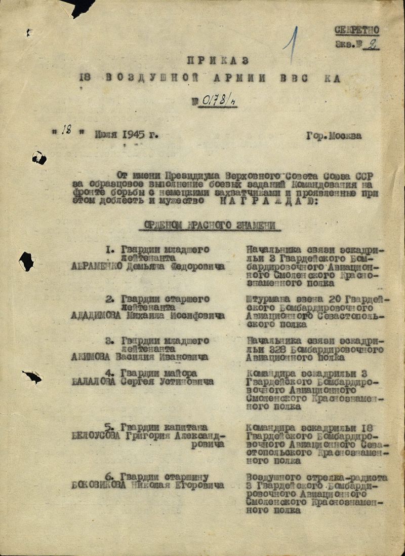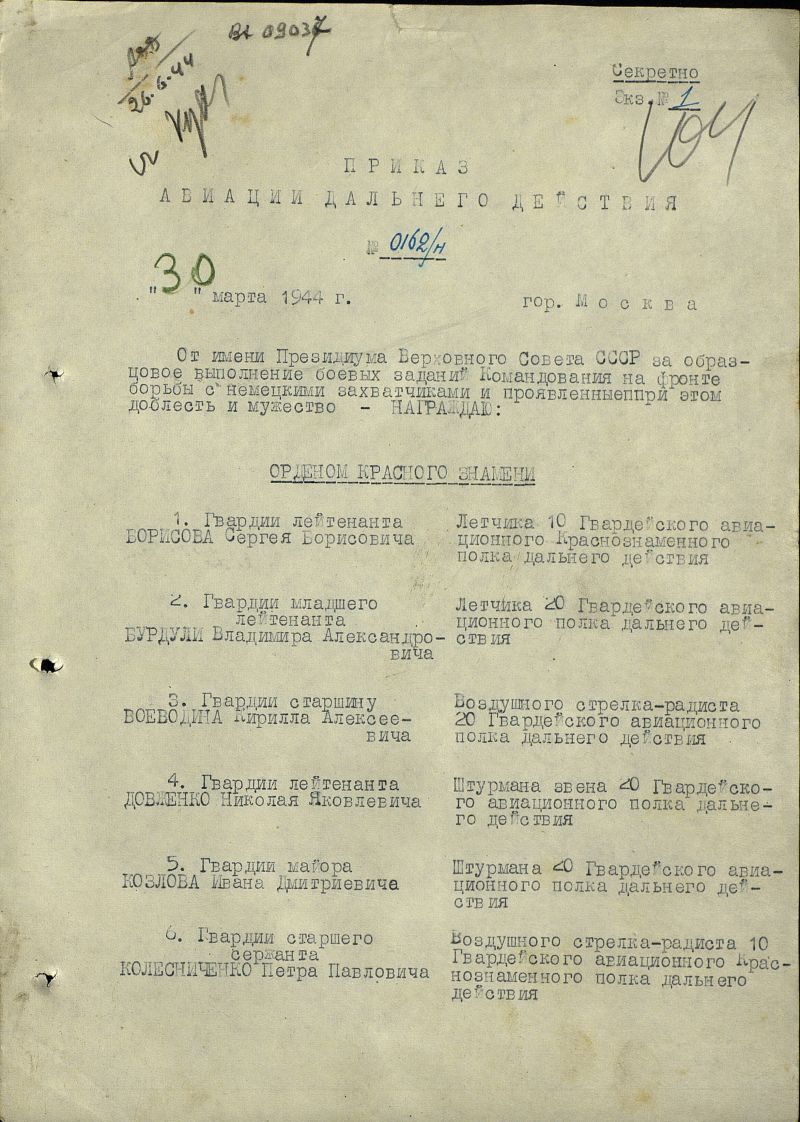 1. Приказ Авиации дальнего действия. 30 марта 1944 года. г. Москва. От имени Президиума Верховного Совета ССР за образцовое выполнение боевых заданий Командования на фронте борьбы с немецкими захватчиками и проявленные при этом доблесть и мужество - Награждаю: