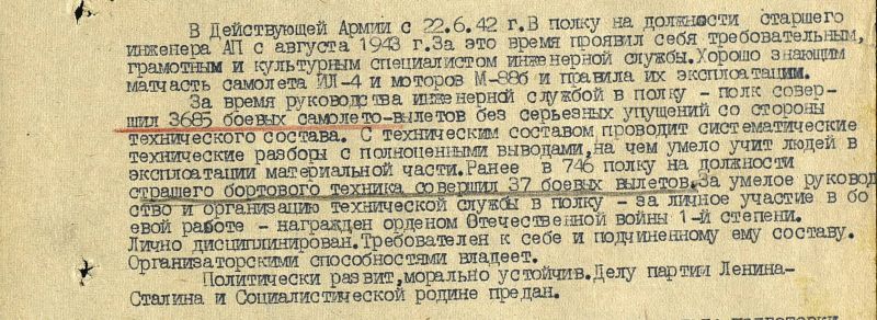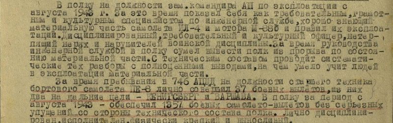 В полку на должности зам.командира АП по эксплоатации с августа 1943 г. За это время показал себя как требовательный, грамотный и культурный специалист по инженерной службе, хоошо знающий материальную часть самолета ИЛ-4 и мотора М-88б и правил их эксплоатаций. Дисциплинированный, требовательный и культурный офицер, нетерпящий нерях и нарушителей воинской дисциплины. За время руководства инженерной службы в полку сумел вывести полк из прорыва по состоянию материальной части. С техническим составом проводит систематические тех. разборы с полноценными выводами, на чем умело учит людей в эксплоатации материальной части.