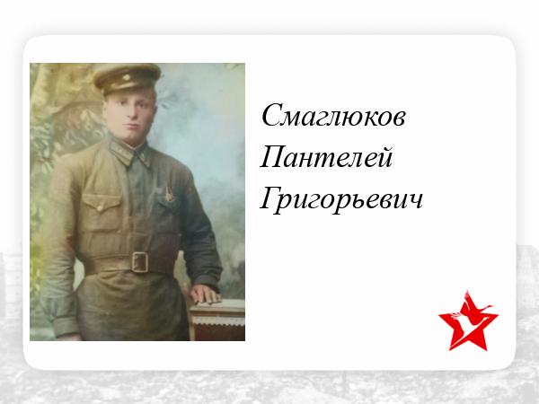 Смаглюков Пантелей Григорьевич, старший брат моего дедушки Сухинова Ивана Константиновича. Уроженец станицы Удобной, Отрадненского района, Краснодарского края. Русский, беспартийный, образование 2 класса начальной школы. Был призван в Советскую Армию в сентябре 1939 года, проходил службу в качестве пулеметчика. Последнее письмо было получено 25.08.1941 года из города Новогрудок 197 А.З.С.Г. После окончания войны его неоднократно розыскивала мать Смаглюкова Домна Ивановна через Отрадненский районный военный комиссариат. Получала разъяснение:"Находясь на фронте Отечественной войны пропал без вести в августе 1941 года."