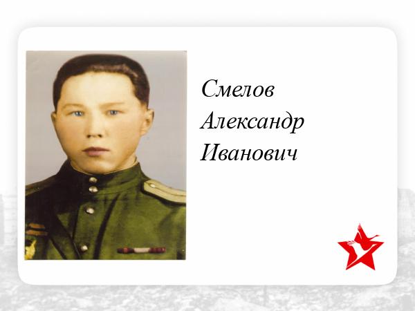 Мой прадедушка Смелов Александр Иванович, родился 06 ноября 1925 года в дер. Яраккассы Моргаушского района ЧР. Он был участником Великой Отечественной Войны 1941-1945 годов и оставил для своих потомков воспоминания, написанные собственноручно. Я- правнучка ГЕРОЯ Великой Отечественной Войны 1941 -1945 года. Но я никогда не думала: «Что такое ГЕРОЙ? Почему ОН, незнакомый мне человек, ГЕРОЙ? Что такое подвиг?» Мой прадед был простым деревенским жителем, родился и вырос в деревне Яраккассы, Моргаушского района республики Чувашия. Вот таким он пошел на войну! Совсем мальчишкой 17 лет! После окончания краткосрочные курсов младших лейтенантов, мой прадед Александр Иванович, ушел на войну в 17 лет и назначен в 1942 году командиром 2-ого огневого взвода минометной батареи 366 стрелковой дивизии в составе Волховского фронта. Он участвовал в прорыве Ленинграда: В ночь на 25 января 1942 года 2-я ударная армия при поддержке 59-й прорвала у деревни Мясной Бор вторую линию немецкой обороны. В пробитую в обороне противника брешь шириной 3-4 км ввели 23, 59-ю стрелковые бригады и 13-й кавалерийский корпус (25, 87 кавдивизии), а затем 366-ю стрелковую дивизию и другие части и соединения 2-й ударной армии. Армия стремительно — по лесам и болотам — начала продвигаться на северо-запад и за 5 дней боев прошла до 40 км. Впереди шел кавалерийский корпус, за ним, расширяя фланги прорыва, — стрелковые бригады и дивизии. За успешные действия 366-ю стрелковую дивизию 17 марта 1942 года преобразовали в 19-ю гвардейскую. Врагу приходилось не только останавливаться перед несокрушимой стеной мужества, но и откатываться назад, неся большие потери. Со слов деда: «Во время наступления каждому бойцу выдали по 5 сухарей и 5 кусков сахара, по 10 патронов на винтовку, по одному диску на автомат или ручной пулемет и по 2 гранаты. Не хватало автоматического оружия, танков, снарядов, транспорта. Разводить костры запрещалось по условиям маскировки, усталые бойцы падали в снег и замерзали насмерть» При блокаде Ленинграда, солдатам выдавали ежедневный паек, чтобы солдаты могли сражаться. Но к ним прибегали голодные детишки и просили кусочек хлеба.. У деда всегда стояли слезы на глазах, когда он вспоминал это. Ведь в ту блокаду погибло много женщин и детей. Против наших войск и их единственной главной коммуникации действовало 250 немецких самолетов, а 2 февраля Гитлер приказал бросить сюда ещё и авиацию дальнего действия. В этом бою был ранен мой прадед, ему пробило 2 ноги осколками, разорвавшейся бомбы, он потерял сознание. Два дня он лежал на поле боя без сознания. Его нашла похоронная бригада и вместе с трупами погрузила на повозку. В этот момент он от боли застонал … Это спасло ему жизнь. Его направили в госпиталь … После ранения участвовал в Оборонительной операции на Белгородско-Курском направлении. Окончание войны прадед дошел до Польши. Его имя упомянуто в музее боевой славы Волховского и Ленинградского фронта. Получил тяжелые ранения в 1943 г и в декабре 1944 года. Смелов Александр Иванович - в должности Командира минометного взвода 37 стрелкового полка 56 Стрелковой Пушкинской Краснознаменной дивизии 18 декабря 1944 года вместе со своим взводом первым форсировал реку Нарва, выбрал хорошие огневые позиции и огнем минометов прикрывал переправу стрелкового батальона. В этом бою взвод под командованием Смелова уничтожил