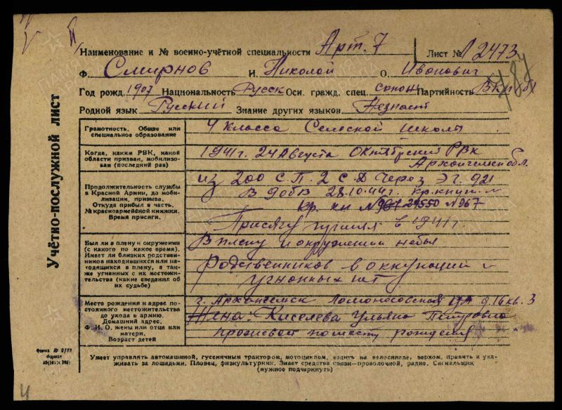 Дата призыва: 24.08.1941 Октябрьский РВК, Архангельская обл., г. Архангельск, Октябрьский р-н