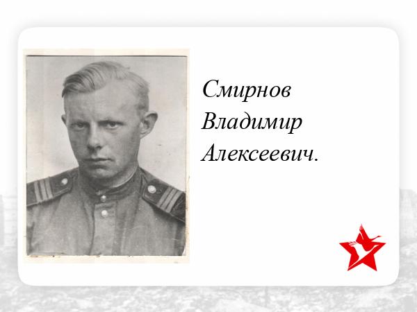 Отец моей жены, Смирнов Владимир Алексеевич родился в Ленинграде в 1925 году и войну встретил 16-и летним мальчишкой.