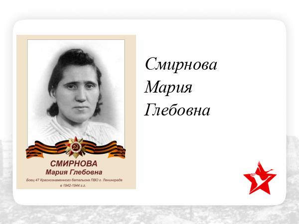 Смирнова Мария Глебовна, родилась в деревне Мишино Ржевского района Калининской области. В 30-е годы прошлого столетия переехала с семьей в Ленинград. До войны работала в магазине продавцом. Когда началась война ушла добровольцем на фронт. Место призыва - Всеволожский РВК Ленинградской области. Участововала в боевых действиях в составе 23 Армии на северных подступах к Ленинграду. Позже продолжила свой боевой путь в составе отдельного 47 батальона ВНОС (войска наблюдения, оповещения и связи) Ладожской дивизии ПВО, была наблюдателем. Актом от 05 сентября 1943 года Смирнова М.Г. была награждена "Медалью за оборону Ленинграда". Демобилизована 25.07.1944 года.