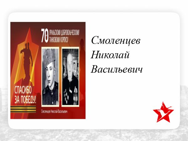 Призывался в Уральский добровольческий танковый корпус в 1943 г. Воевал в 56 Гвардейская Васильково-Шепетовская ордена Ленина, Краснознамённая, орденов Суворова и Кутузова танковая бригада.
