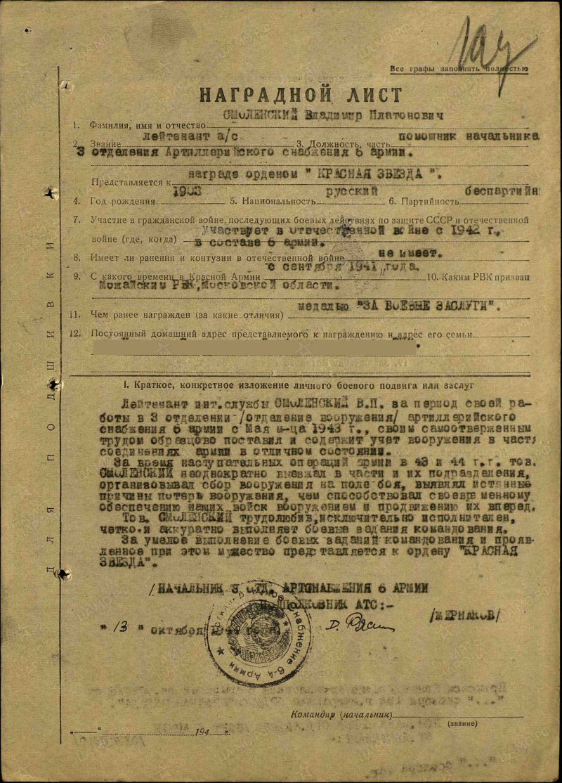 Время поступления на службу: __.09.1941 Место призыва: Можайский РВК, Московская обл., Можайский р-н https://poisk.re/awards/150238107