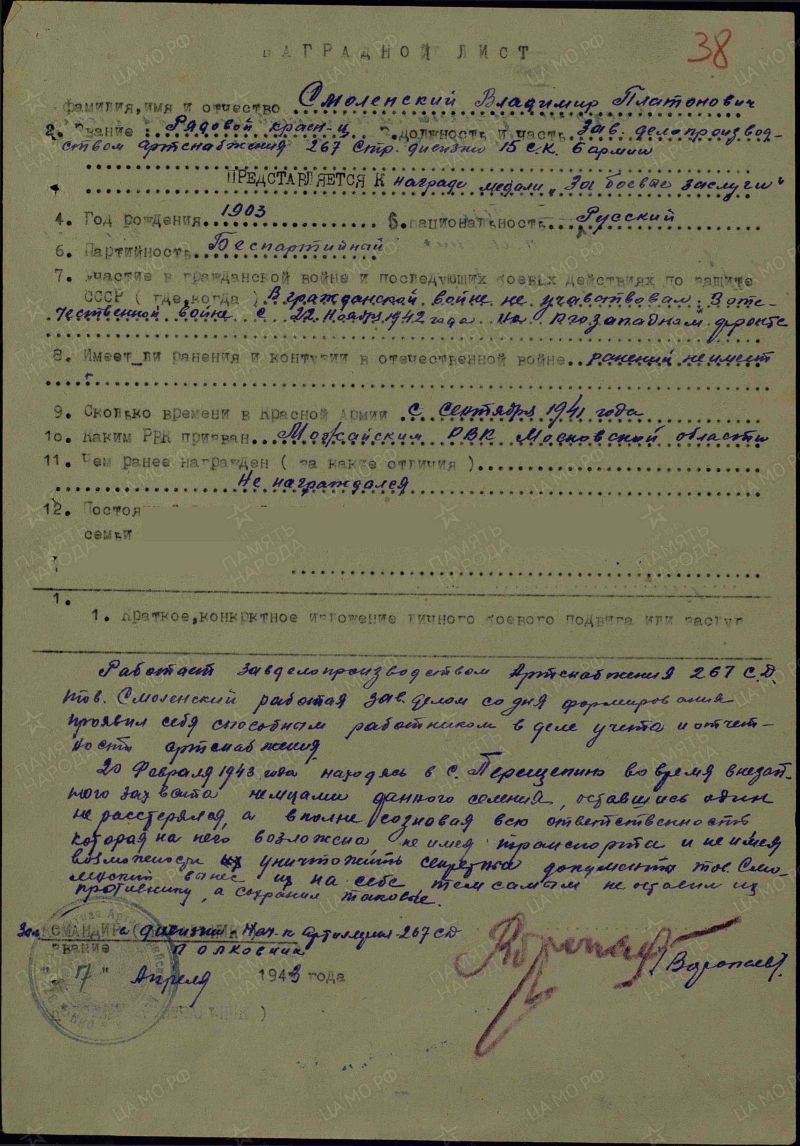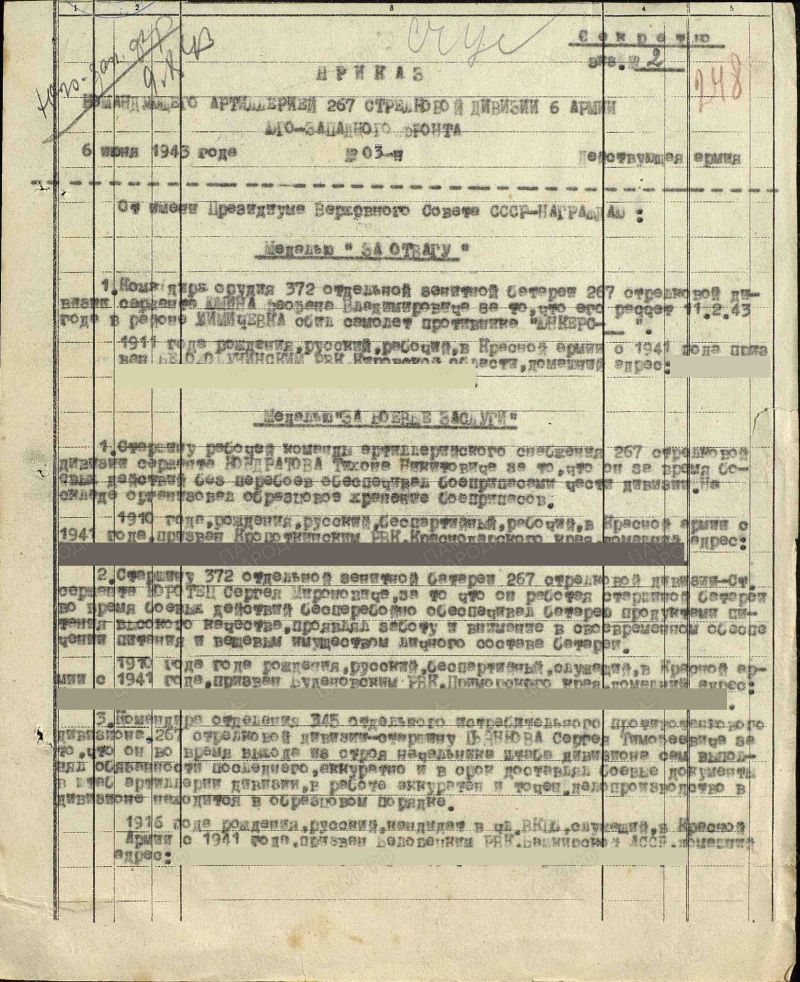 Наградной документ. Воинская часть: 267 стрелковая дивизия. Кто наградил: 267 сд 6 А Юго-Западного фронта. Приказ подразделения №: 3/н от: 06.06.1943 Издан: 267 сд 6 А Юго-Западного фронта https://pamyat-naroda.ru/heroes/podvig-chelovek_nagrazhdenie16681661/