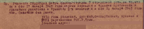 Рядового Смолякова Петра Фомича, стрелка 7 стрелковой роты, наградили медалью "За отвагу" за то, что он 17 января 1945 года первым ворвался в траншеи противника, где убил трех немцев гранатой. Позже, 20 января, он был ранен и направлен в госпиталь. После выздоровления его демобилизовали. Умер уже дома, 1991 году.