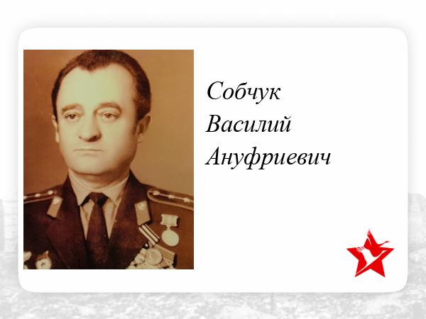 «8. Старшину медицинской службы СОБЧУК Василия Ануфриевича – санинструктора второго дивизиона за то, что он 5 апреля 1944 года в бою за деревню ВОЛКИ Перовского района, рискуя жизнью, под огнем противника оказал первую помощь и эвакуировал с поля боя 12 человек бойцов, а также оказал первую помощь и вынес с поля боя командира 6-й батареи лейтенанта МЕТАЛЬНИКОВА, чем спас ему жизнь».