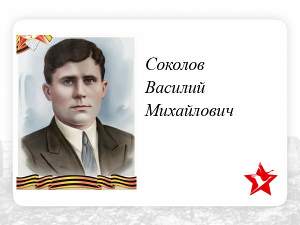 Дедушка моей супруги Соколов Василий Михайлович родился в крепкой крестьянской семье в д. Радьково, Калининской области. Семья была многодетной, дружной. В начале двадцатых годов вместе с родителями переехали жить в Петербург. Воевал в Финскую войну. Потом работал на заводе "Севкабель" в Ленинграде. Имел отсрочку от службы, но ушел воевать добровольно в Ленинградское народное ополчение. Семья его осталась в блокадном Лениграде. Потом их эвакуировали. Собирался встретиться с ними, ожидая отпуск по ранению. Но умер от болезни в полевом эвакогоспитале г. Курган. "В боях за социалистическую Родиу, верный воинской присяге, проявил геройство и мужество, попал в госпиталь и умер от болезни." Так было написано в пришедшей похоронке... Похоронен в братской могиле воинского захоронения в г. Курган.