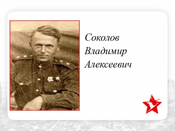 Боевой путь батальона пролег через Польшу, Восточную Пруссию и закончился в Берлине. За боевые заслуги В.А. Соколов награжден Орденом Красной Звезды (за обеспечение прорыва на Курской дуге), Орденом Отечественной войны 2-й степени (за прорыв обороны врага на Белорусском фронте), медалью "За победу над Германией".