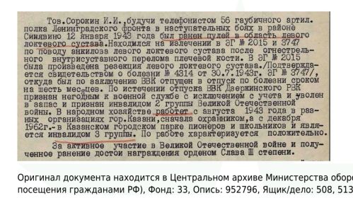 Сорокин Иван Илларионович был связистом 56 гаубичного артиллерийского полка в составе Ленинградского фронта. 12 января 1943 года в наступательных боях в районе Синявино, при выполнении боевого задания, получил серьезное ранение. Был госпитализирован. Больше полугода находился на лечении в госпиталях. В одном из них санитаркой работала моя бабушка. Там они и познакомились. Так на войне он встретил любовь всей своей жизни. После нескольких операций 30.07.1943г. дед был выписан, к сожалению, окончательно восстановиться не удалось (левая рука осталась в ограниченной двигательной активности), дед был признан инвалидом Великой Отечественной войны 2 группы. В возвращении на фронт было отказано. Дед пошел трудиться на завод.