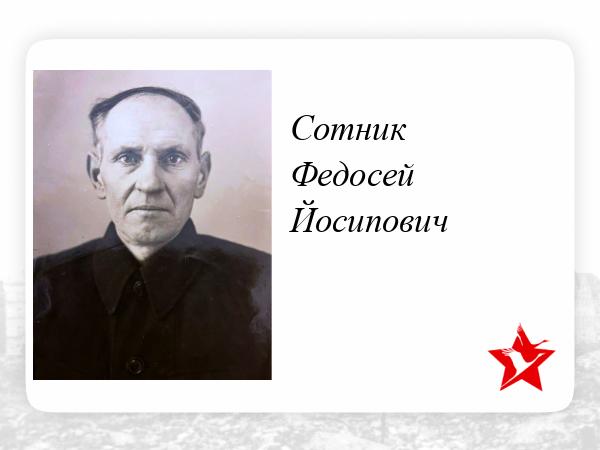 Федосей Йосипович родом из Борзнянского района Черниговской области. Прошел всю войну. Разведчик. Закончил войну в Прибалтике. После войны работал трактористом, руководителем тракторной бригады. Имеет награды.