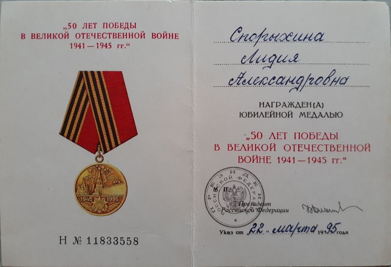 Награждена Юбилейной медалью «50 лет Победы в Великой Отечественной войне 1941-1945 гг.»