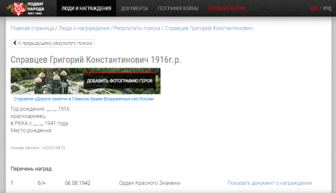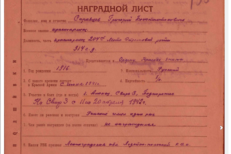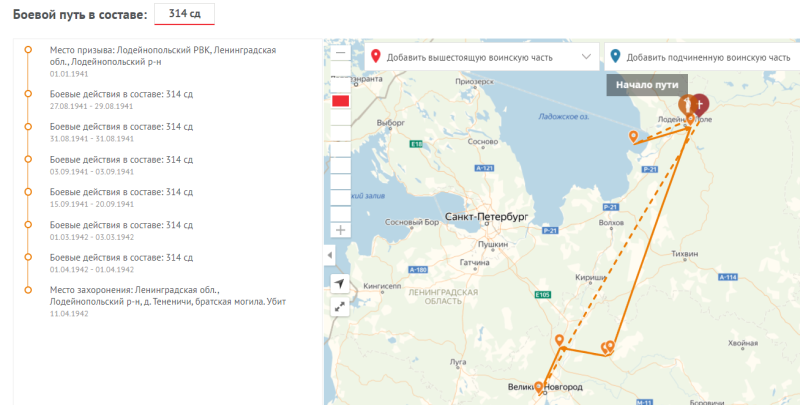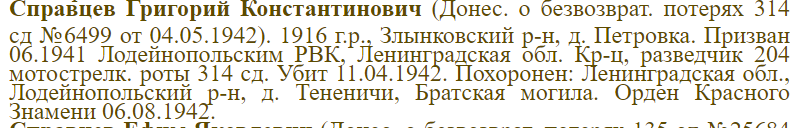 11.04.1942 Причина выбытия убит Первичное место захоронения Ленинградская обл., Лодейнопольский р-н, д. Тененичи, братская могила