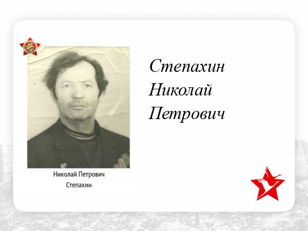 Степахин Николай Петрович родился в дер.Чемодановка Рязанской губернии в 1923г. Был призван в ноябре 1941 года. Воевал в составе 16 армии 12 Гвардейской дивизии 23 минометном отдельном дивизионе на направлении Старой Смоленской дороги.Был ранен 9 июля 1942г. под г.Белая церковь. Дважды награжден Орденом Славы.